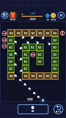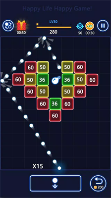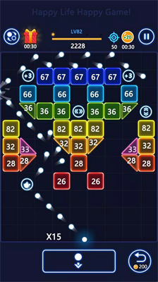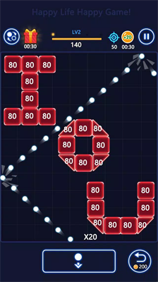 游戏采用直观的触控操作模式,长按屏幕即可调整发射角度,松手瞬间弹球阵列将以抛物线轨迹冲击砖块矩阵。每轮发射后需及时调整底部反弹板位置,通过精准计算二次碰撞路线实现连击效果。随着关卡推进,特殊道具会随机掉落,包括激光穿透器、范围爆破装置等强化道具,助玩家突破复杂结构关卡。