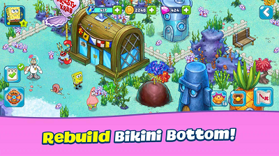 游戏创新性地将建造经营与冒险探索相结合。通过清理果酱污染的海域,玩家可收集木材、生菜等资源修复建筑,还能在专属农场培育特色作物。与螃蟹老板交易系统、宠物养成玩法的结合,让游戏体验充满策略趣味。角色技能系统尤为亮眼,海绵宝宝的泡泡清洁术与派大星的强力冲击各具特色。