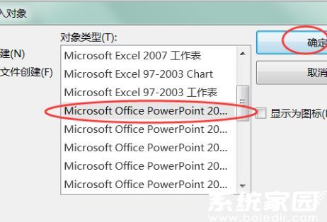 3. 在对象类型窗口选择「Microsoft PowerPoint 幻灯片」选项,勾选「显示为图标」复选框