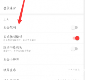 3、进入设置面板后,滑动至「工具」分类模块。桌面歌词开关位于该模块中部位置,与定时关闭、车载模式等功能并列显示,注意区分相似功能避免误操作。