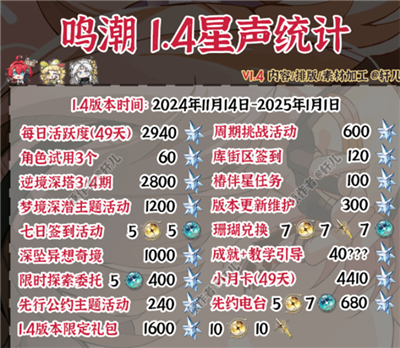 鸣潮1.4版本能获取多少抽卡资源?这款以未来科幻为背景的开放世界手游,凭借高品质的3D建模与沉浸式战斗体验,即将迎来全新版本迭代。1.4版本将延续多维度的资源获取体系,玩家可通过版本主题活动、限时挑战与日常积累获得丰厚星声奖励,以下为2024年11月14日至2025年1月1日版本周期内的完整资源获取分析。