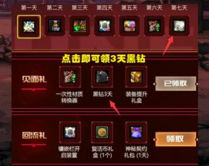 页面底部设有全民可领的基础福利包,内含3日黑钻体验与装备提升礼盒。针对回流玩家与心悦会员的专属礼包需满足特定条件领取,建议玩家根据自身账号状态及时获取。