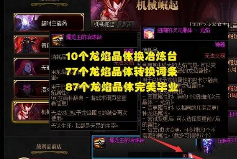 作为高阶装备强化材料,龙焰晶体主要作用于武器系统的第三词条优化。通过特定NPC处兑换的「爆龙王的冶炼台」,玩家可激活装备隐藏属性栏位。该道具需消耗10个龙焰晶体进行兑换,建议优先在攻坚商店完成此项基础配置。